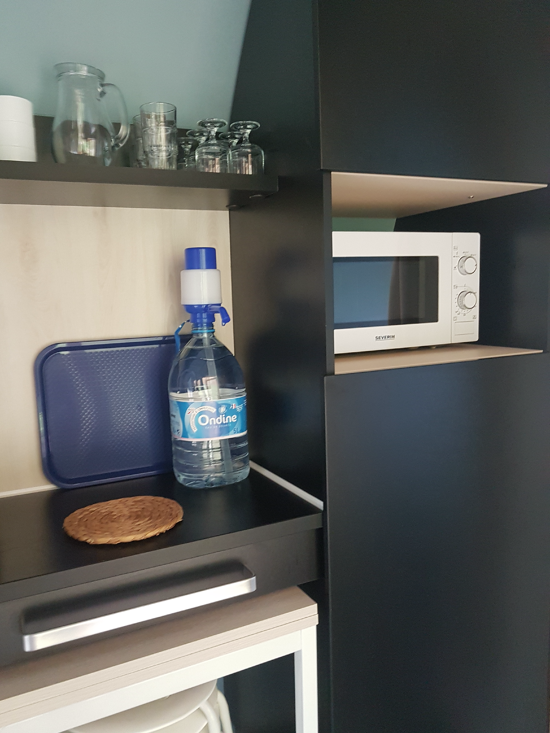 1 kitchen area with electric plates, microwave, coffee maker, fridge top.