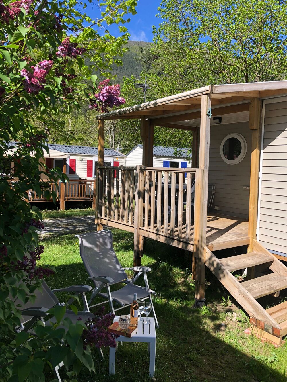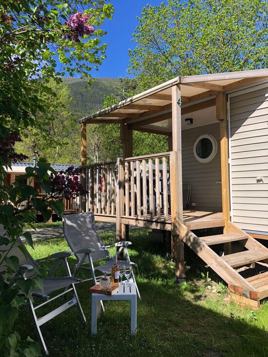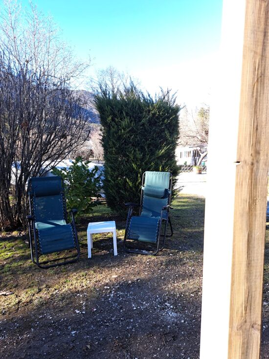 Terrasse couverte avec table, chaises et relax