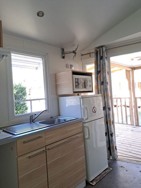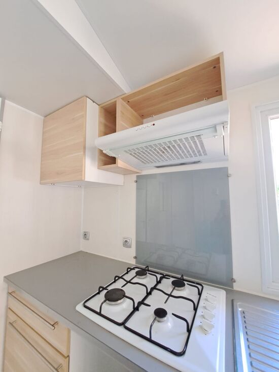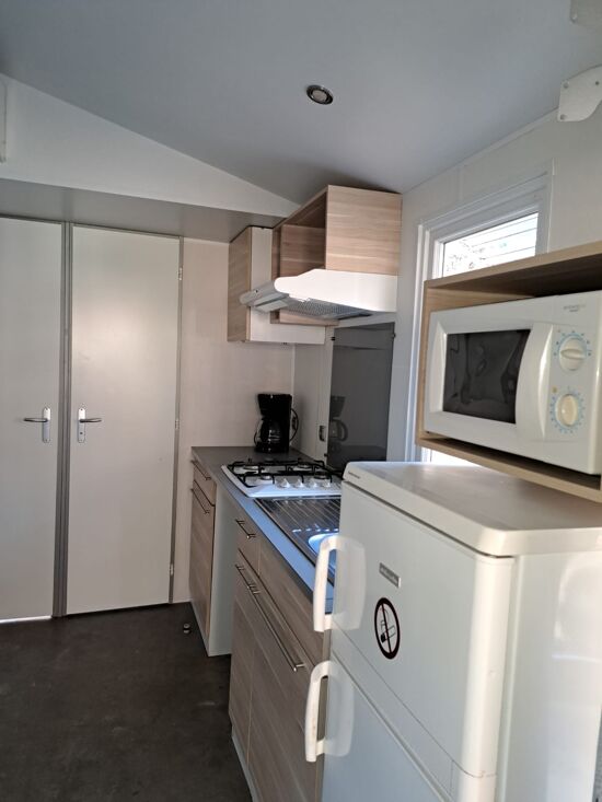 Cuisine aménagée d'un réfrigérateur/congélateur, plaque de cuisson gaz, hotte, lave-vaisselle, micro-onde, cafetière, télévision, vaisselle et ustensiles de cuisine